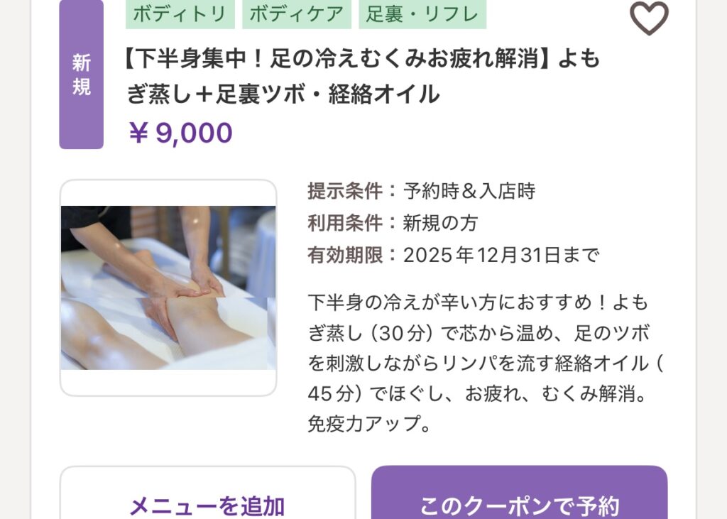 よもぎ蒸しと下半身経絡オイルマッサージの下半身集中コースがおすすめです。ホットペッパービューティーよりお得なクーポンをご利用ください。
